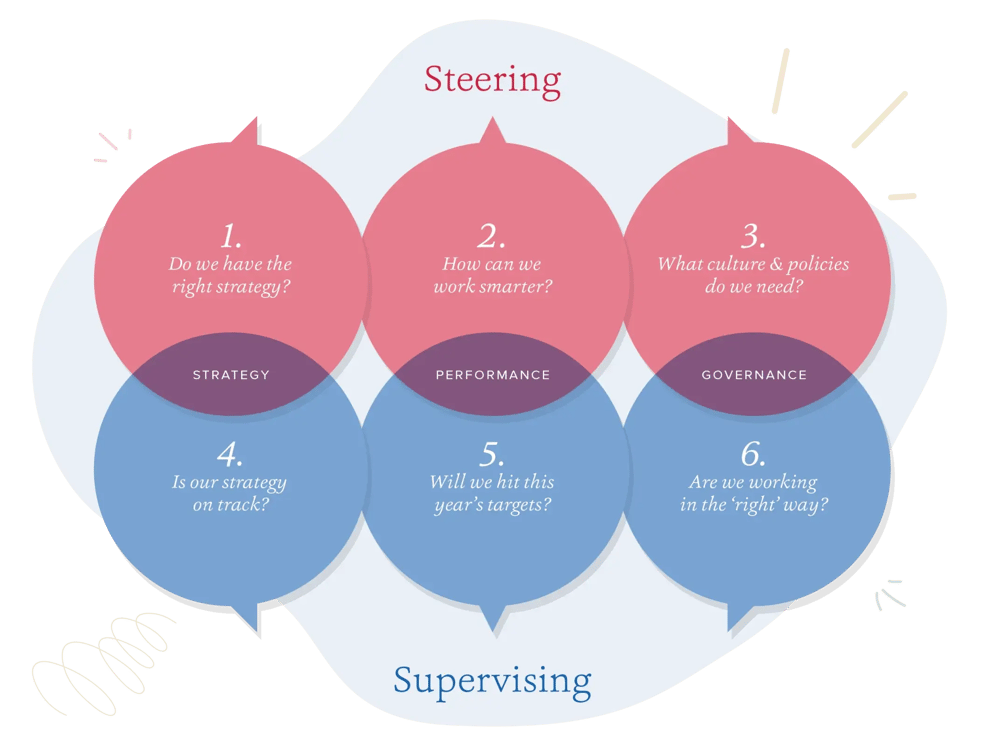 - Supervising: The board’s role is to monitor performance and seek assurance.