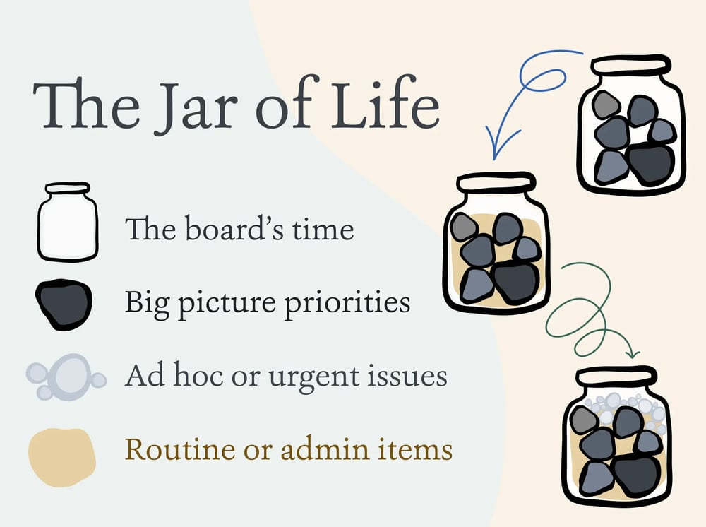 We suggest taking the “jar of life” approach to agenda planning because board time is limited, like the space inside a glass jar. Fill your imaginary jar with rocks, sand, and pebbles.