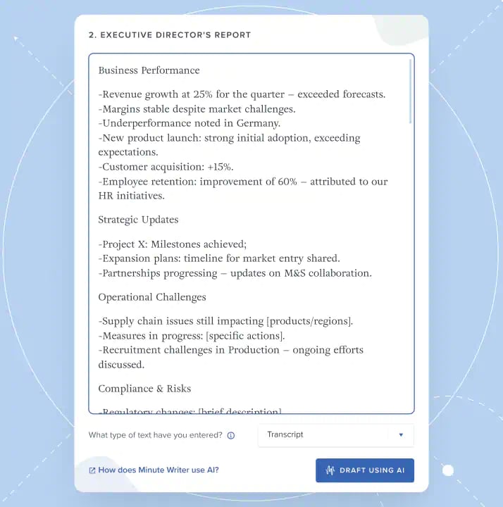 Board Intelligence’s Minute Writer tool makes this process easier by drafting precise, compliant minutes automatically. -